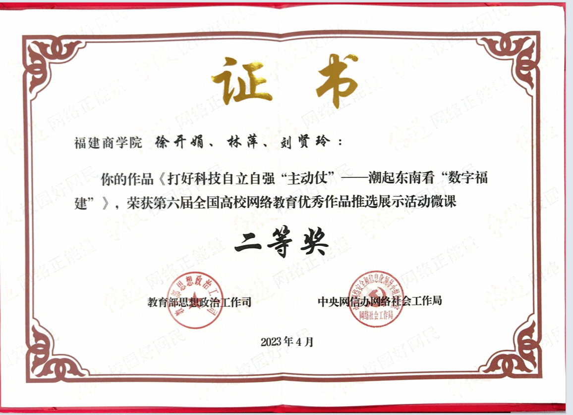 公司徐开娟老师的作品《打好科技自立自强“主动仗”-----潮起东南看“数字福建”》,荣获第六届全国高校网络教育优秀作品推选展示活动微课二等奖。