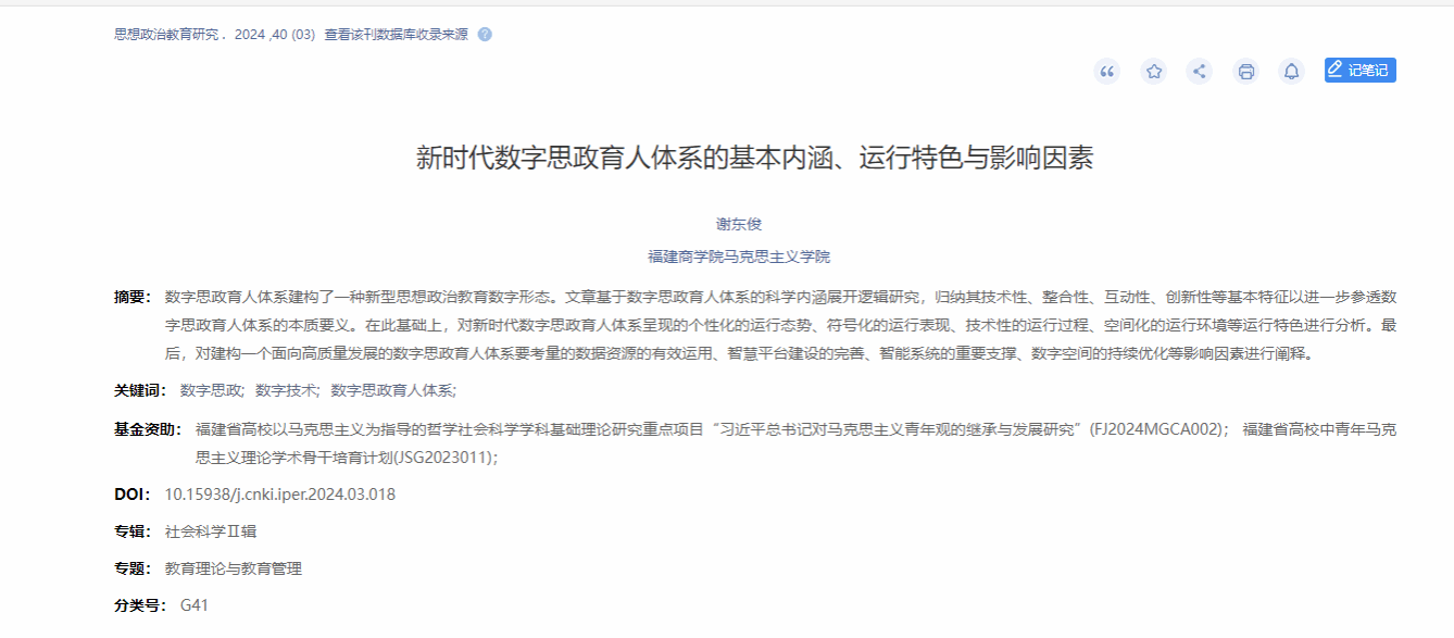 近日,公司谢东俊副经理在北大核心期刊《思想政治教育研究》发表文章《新时代数字思政育人体系的基本内涵、运行特色与影响因素》