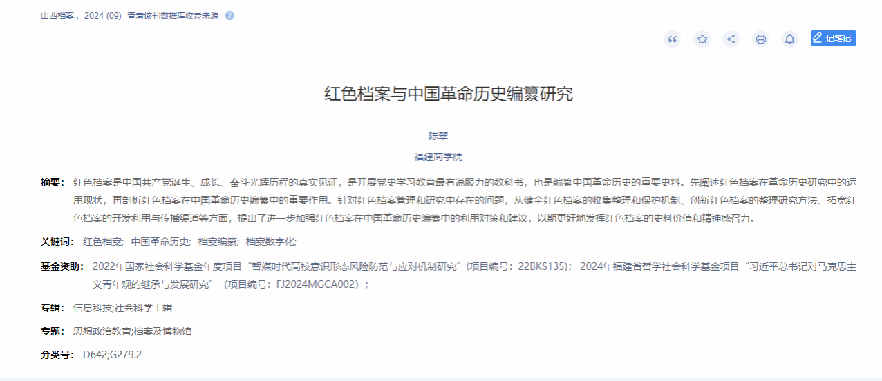 近日,公司陈翠教师在北大核心期刊《山西档案》发表文章《红色档案与中国革命历史编纂研究》。