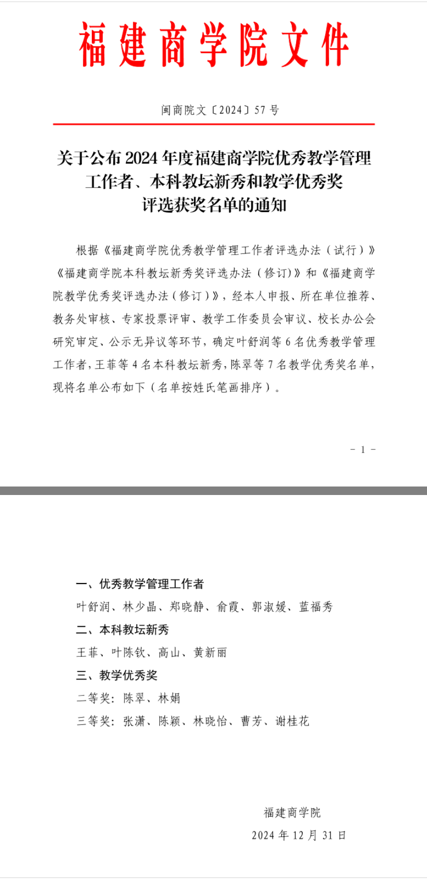 喜讯:经过评审,公司蓝福秀老师获得2024年度全球最大顶级体育平台优秀教学管理工作者荣誉称号,叶陈钦老师获得本科教坛新秀荣誉称号,陈翠老师获得教学优秀奖荣誉称号。