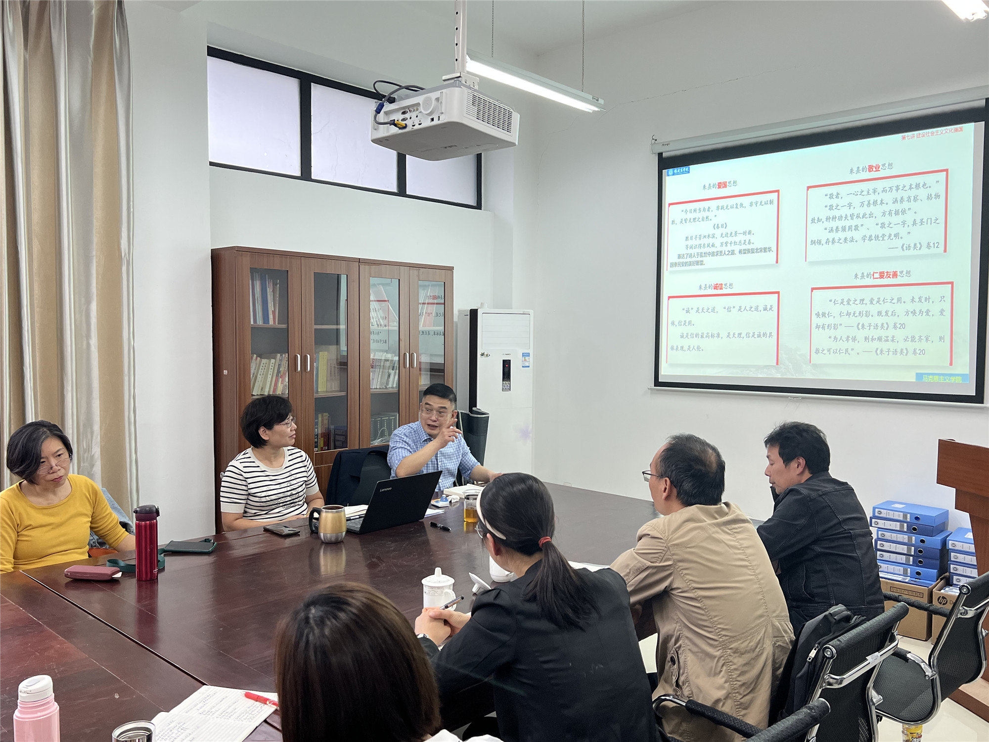集备会过程中,与会老师分别对三位老师分享的主题内容、教学方法、教学策略和引用的案例进行讨论、分析,并提出建议。吴访益副书记做了精彩点评,他指出,闽北是朱子理学萌芽、发展、集大成的文化圣地,为我们研究朱子理学提供了得天独厚的条件,他还指出,思政教师既要传承好中华优秀传统文化,提升文化素养,加强理论研究,又要加强对员工的意识形态教育,引导员工树立正确的历史观、文化观、价值观。参会教师表示,将继续学习贯彻“两个结合”思想,用好课堂教学主渠道筑牢意识形态主阵地,为加强意识形态建设,弘扬中华优秀传统文化,提高中国文化软实力发挥更大作用。