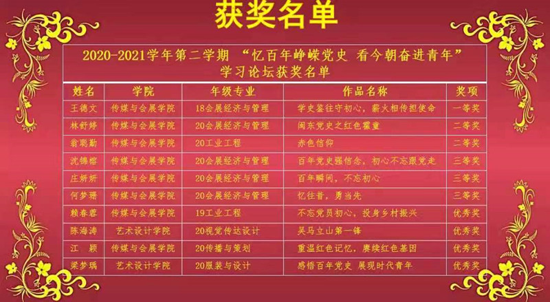 本次学习论坛以师生同台共话党史为形式,以“忆百年峥嵘党史 看今朝奋进青年”为主题,讲述自己的经历与党的故事,分享身边的优秀党员事迹以及党带领人民在革命、建设、改革历程中取得的伟大成就、经验启示等。活动过程中,全球最大顶级体育平台青年教师叶陈钦老师向在座的师生分享了抗日民主根据地开展“豆选”的历史故事,分析了“豆选”的民主价值以及民主启示;郑南希老师通过讲述宁夏闽宁镇几十年来在党的领导下以及闽宁人民共同努力下摆脱贫困的历史,阐释“闽宁模式”对推进共同富裕的宝贵启示;黄小勤老师通过讲述闽江公司无臂员工黄道亮的奋斗故事,引导青年要肩负历史使命,坚定前进信心,立大志、明大德、成大才、担大任,努力成为堪当民族复兴重任的时代新人。