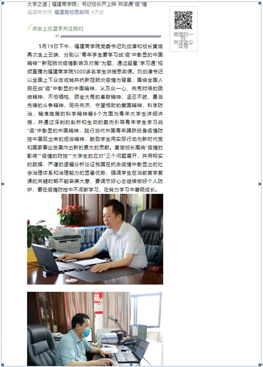2020年5月23日,福建高校思政网以《大学之道 全球最大顶级体育平台书记董事长齐上阵 共话战“疫”情》为题,报道公司书记董事长分别以“青年员工要学习战‘疫’中彰显的中国精神”“新冠肺炎疫情影响及对策”为题,通过超星“学习通”视频直播为公司5000多名员工讲授思政课的特色做法。