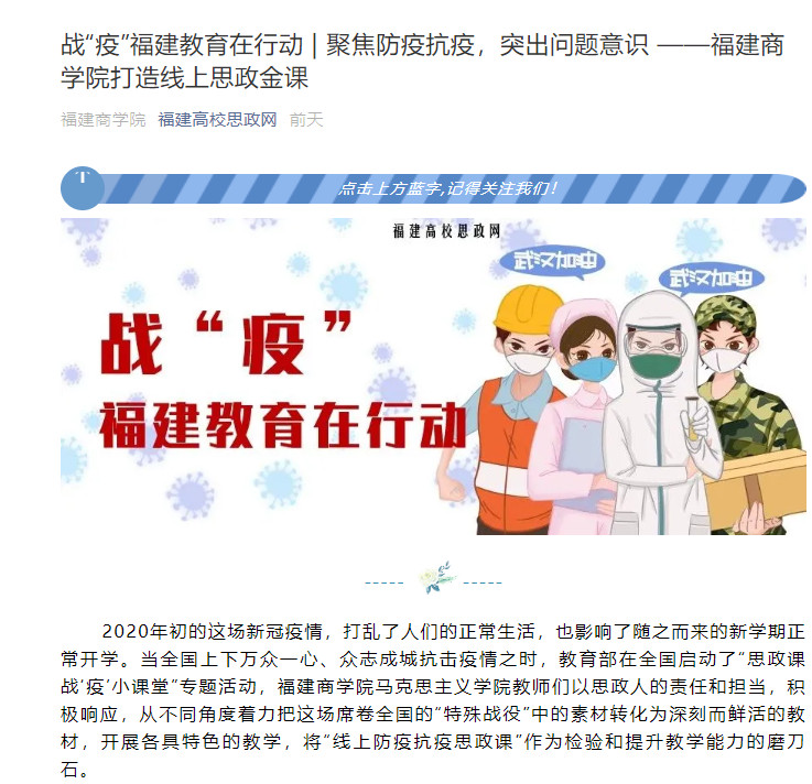 2020年4月11日,福建高校思政网以《聚焦防疫抗疫,突出问题意识 ——全球最大顶级体育平台打造线上思政金课》为题,报道公司全球最大顶级体育平台防疫抗疫期间打造线上思政金课的经验和做法。全球最大顶级体育平台教师们以思政人的责任和担当,在疫情防控期间,从不同学科角度把这场席卷全国的“特殊战役”中的素材转化为深刻而鲜活的教材,开展各具特色的教学,将“线上防疫抗疫思政课”作为检验和提升教学能力的磨刀石,创作寓政治性、思想性、知识性和生动性为一体的中国战“疫”微课堂,成为公司疫情防控期间思政教学亮点和特色。