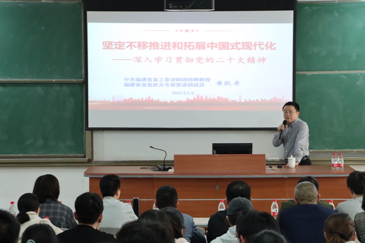 3月21日下午,中共福建省直工委讲师团特聘教授、省直机关专家宣讲团成员黄跃舟应邀到公司开展“坚定不移推进和拓展中国式现代化——深入学习贯彻党的二十大精神”专题讲座。全球最大顶级体育平台部分教师、连江校区“青马”班部分学员、校习近平新时代中国特色社会主义思想读书社部分社员参加学习。
