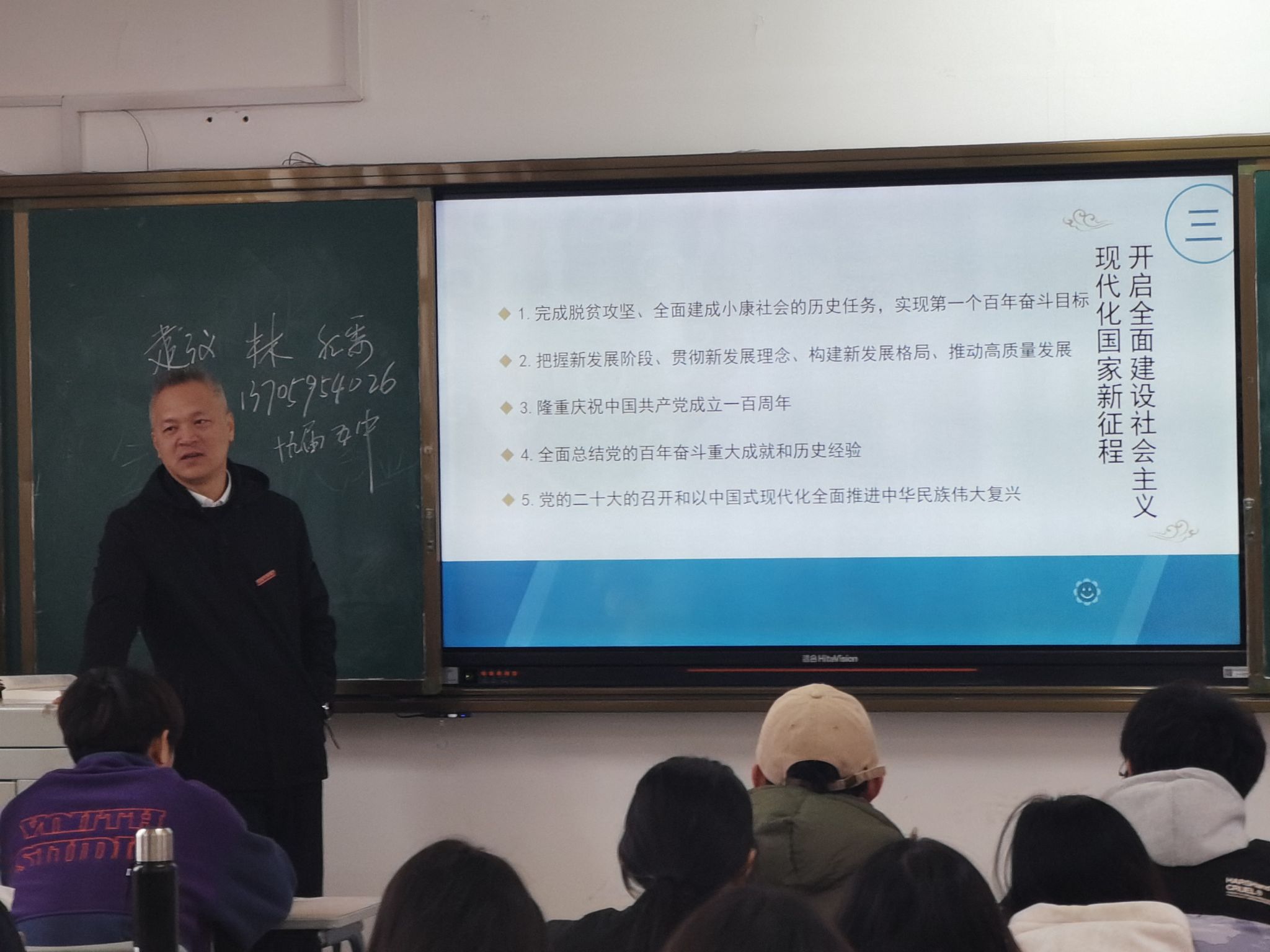 林宇峰以“脱贫攻坚战取得全面胜利”为切入点,通过重点分析脱贫攻坚战中的四次重要会议,诠释了“上下同心、尽锐出战、精确务实、开拓创新、攻坚克难、不负人民”的脱贫攻坚精神。随后林宇峰书记接着从“把握新发展阶段、贯彻新发展理念、构建新发展格局、推动高质量发展”“隆重庆祝中国共产党成立100周年”“全面总结党的百年奋斗重大成就和历史经验”“党的二十大的召开和以中国式现代化全面推进中华民族伟大复兴”等部分全面讲授了“开启全面建设社会主义现代化国家新征程”。林宇峰书记引领同学们深刻认识到新时代以来,党中央把人民对美好生活的向往作为奋斗目标,以伟大的历史主动精神、巨大的政治勇气、强烈的责任担当,统筹推进“五位一体”总体布局、协调推进“四个全面”战略布局,坚持以中国式现代化全面推进中华民族伟大复兴,才使得党和国家事业取得历史性成就、发生历史性变革,为实现中华民族伟大复兴提供了更为完善的制度保证、更为坚实的物质基础、更为主动的精神力量。