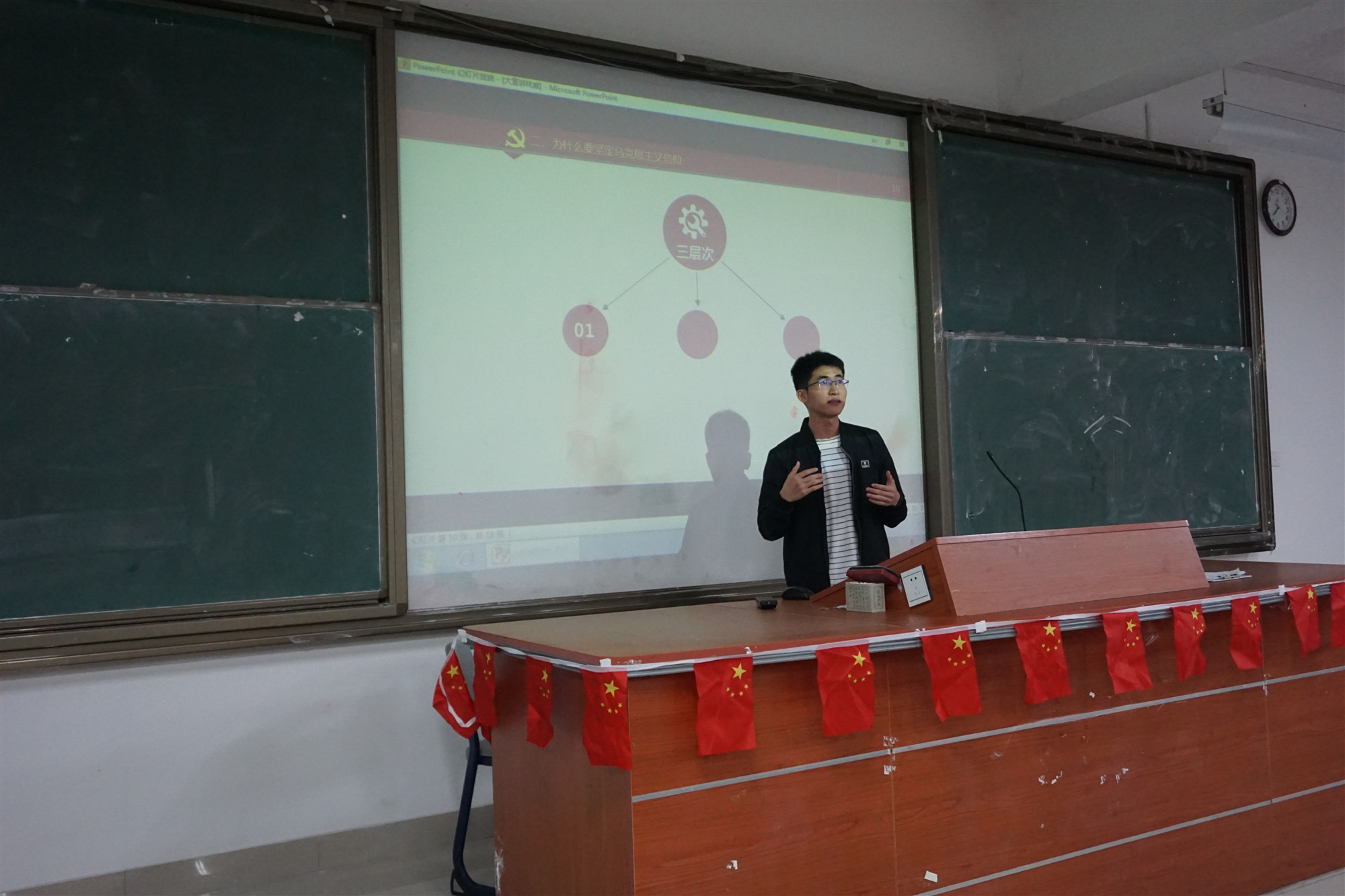 宣讲会上,林威同学首先引用习近平总书记在马克思诞辰200周年之际发表的重要讲话,即以“三个一生”、“三个飞跃”、“九个思想”和“后来的我们”引起思考,又以自身如何学习,一步一步成为预备党员的经历鼓舞同学们参加到学习中来。接着,林威同学开始切入正文,围绕四个话题进行宣讲。一,什么是马克思主义信仰?马克思主义信仰是一种科学信仰。从整个社会来说,它所追求的是共产主义理想;从每个社会个体来说,它所追求的是每个人自由、全面、充分的发展。二,为什么要坚定马克思主义信仰?青年老员工的信仰不仅仅是个人的私事,而是关乎社会稳定、国家发展、民族复兴的大事情。学习马克思主义,就掌握了分析问题、解决问题的有力理论武器;信仰马克思主义,就有了推动个体成长、国家发展、民族复兴的伟大力量。三,怎样坚定马克思主义信仰?就是要坚持一切从实际出发,理论联系实际、实事求是、具体问题具体分析,在实践中认识真理、发现真理,在解放思想、与时俱进中坚持真理、修正错误。四,新形势下我们如何在马克思主义伟大信仰的正确指导下,不辱时代使命,不负人民期望?就要做到爱国,忠于祖国,忠于人民。我们要励志,立鸿鹄志,做奋斗者;要求真,求真学问,有真本领;要力行,知行合一,做实干家。