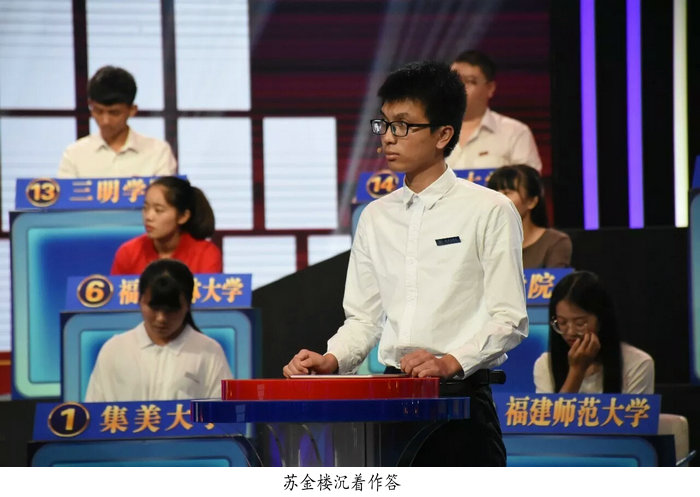 苏金楼同学在此前的比赛中,憾失前五张决赛入场券。在23日下午的决赛中,他首先作为20人竞答团选手进入比赛,并以29分的成绩在竞答团中脱颖而出,获得最后一张决赛入场券,与来自此前已进入决赛的福州大学、福建农林大学、三明公司的选手展开最后的角逐。