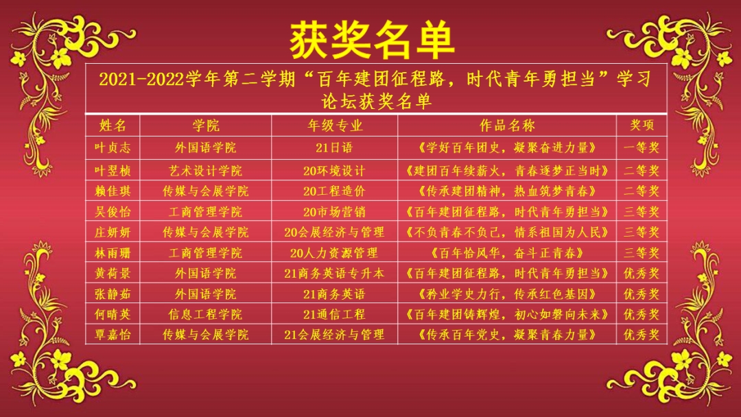 本次学习论坛比赛从4月份开始,共有1100多人参加了小组赛,在经历近2个月的选拔赛后,共有10名同学入围决赛。决赛过程中,10位参赛选手紧扣主题,围绕党史、团史、新中国史、改革开放史和社会主义发展史,讲述中国共产党人、中国共产主义青年团团员在百年奋斗历程的不同时期践行初心使命、拼搏奋斗中的感人事迹,绘声绘色地抒发对党、对祖国、对中国特色社会主义事业的忠诚热爱,激励广大青年老员工自觉听从党和人民召唤,在学思践悟中坚定理想信念,赓续内在精神血脉。最终,外国语公司21级日语专业叶贞志同学获得一等奖,此外还评选出二等奖2名,三等奖3名,优秀奖4名。