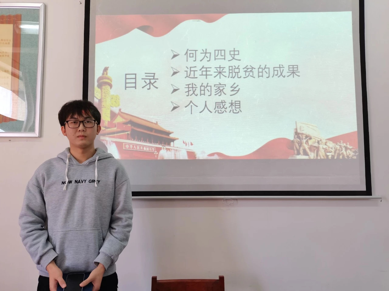 赖炜彪同学作了题为《聚焦“四史”学习 全面建成小康社会》的宣讲。他在宣讲中讲述了总书记曾经在福建工作时带领福建人民摆脱贫困的历史,并结合国家脱贫攻坚的历史分析了学习“四史”的重要性。他认为今年是全面建成小康社会的决胜之年,全国各个地区的脱贫工作都取得了巨大成就,我们要立足当下、抓住机遇、迎接挑战,自觉担当起实现中华民族伟大复兴的使命。