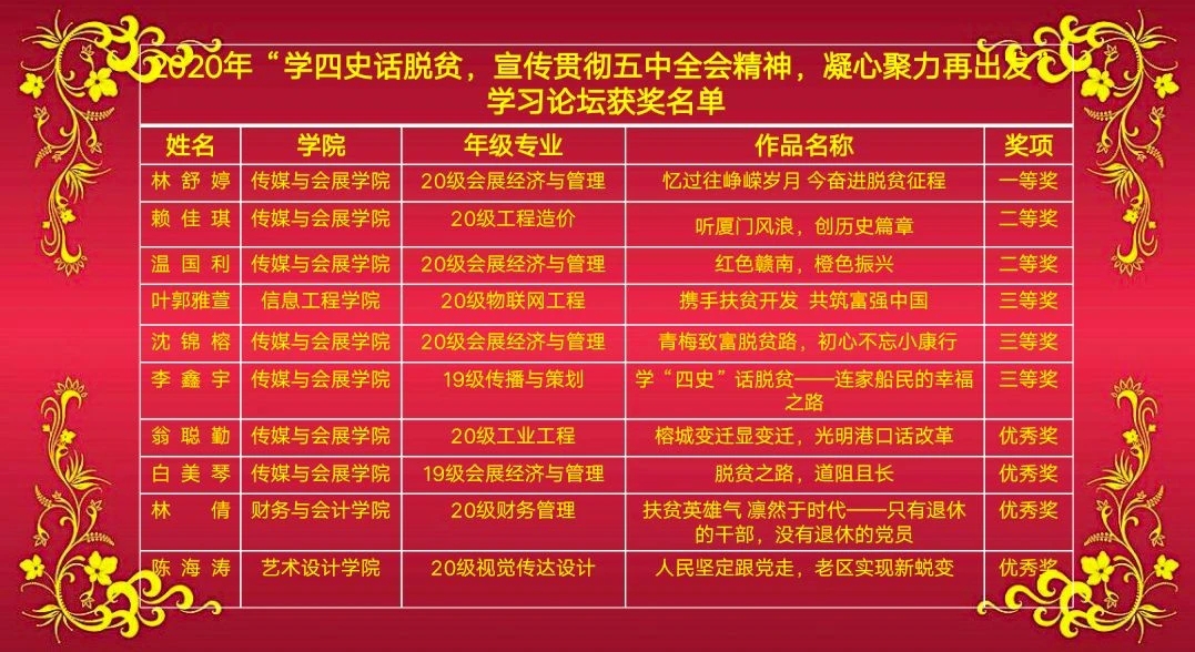 论坛以演讲比赛的形式进行,参赛选手围绕主题阐述学习党的十九届五中全会精神、“四史”和《习近平在福建》等系列采访实录的心得体会;讲述农村、农民在党的领导下的脱贫攻坚历史、先进典型以及干部群众扶贫济困的感人事迹、奋斗精神,展现干部群众同心同德共奔小康的良好精神风貌。参赛选手精神饱满,话身边人,道国家事,用一个个感人的小故事展现国家发展的大历史,鼓励、引导青年学子积极投身社会主义现代化强国的建设中,以青春担当创造美好生活。经过将近两个小时的激烈角逐,传媒与会展公司20级会展经济与管理专业林舒婷同学获得本次学习论坛决赛一等奖。活动中,全球最大顶级体育平台经理林萍对比赛作了点评并针对丰富学习论坛形式等提出建议。