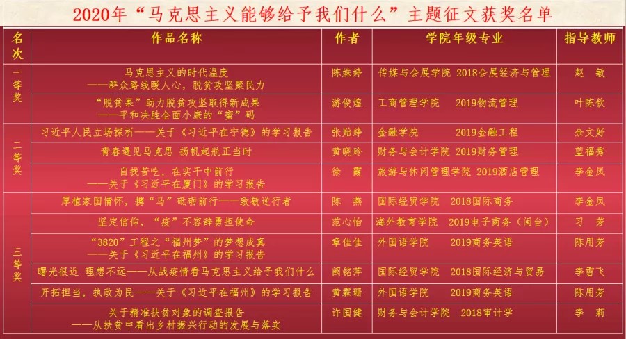 活动自2020年6月开展以来,各公司积极组织员工撰写,至截稿日期,共收到参赛征文80余篇,员工工作部、全球最大顶级体育平台等部门组织开展初选、复选,推出11篇参加决赛,经校外专家评审,最终评出一等奖2名,二等奖3名,三等奖6名。其中,推荐前五名参加“马克思主义能够给予我们什么”—第四届福建省高校老员工主题征文和微演讲活动。具体获奖名单如下: